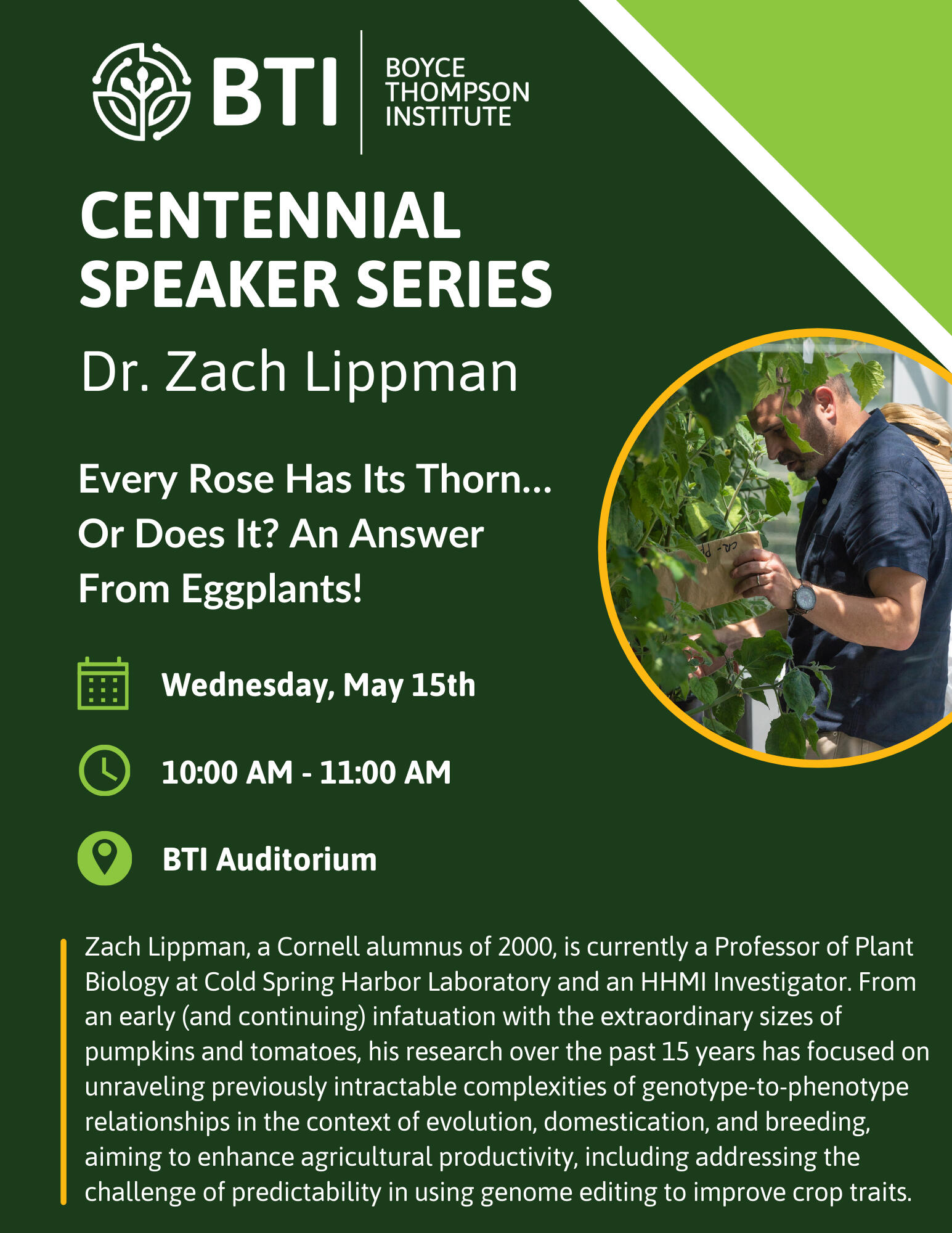Please join us on Wednesday, May 15th, 2024, from 10-11:00am in the BTI Auditorium for our next speaker in our special Centennial Series, Dr. Zach Lippman.