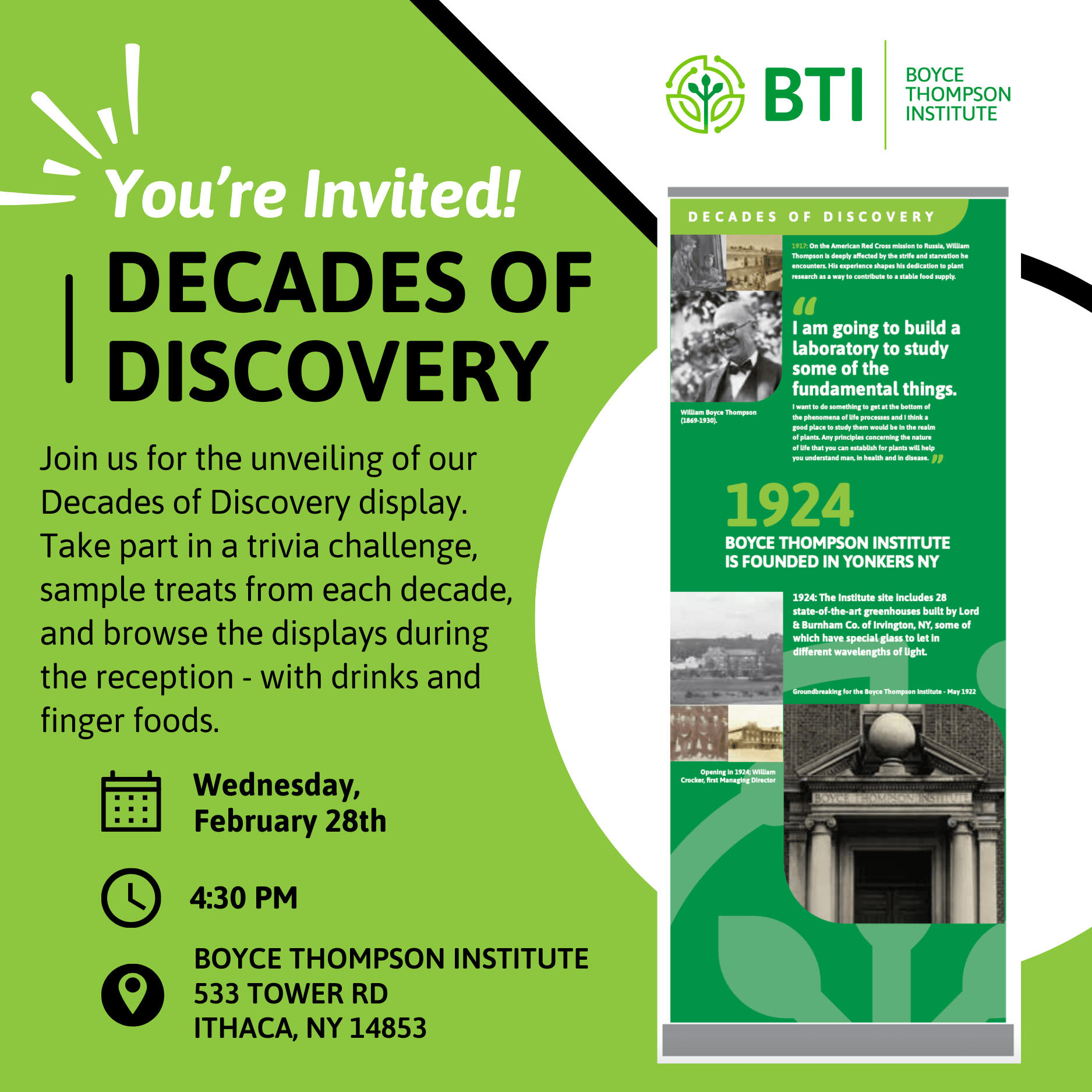 Join Boyce Thompson Institute to celebrate the start of our Centennial celebrations as we honor 100 years of research and BTI’s past, present, and future with the planting of a time capsule in BTI’s atrium. Don’t miss a toast by President Silvia Restrepo and an exciting announcement about BTI’s future!