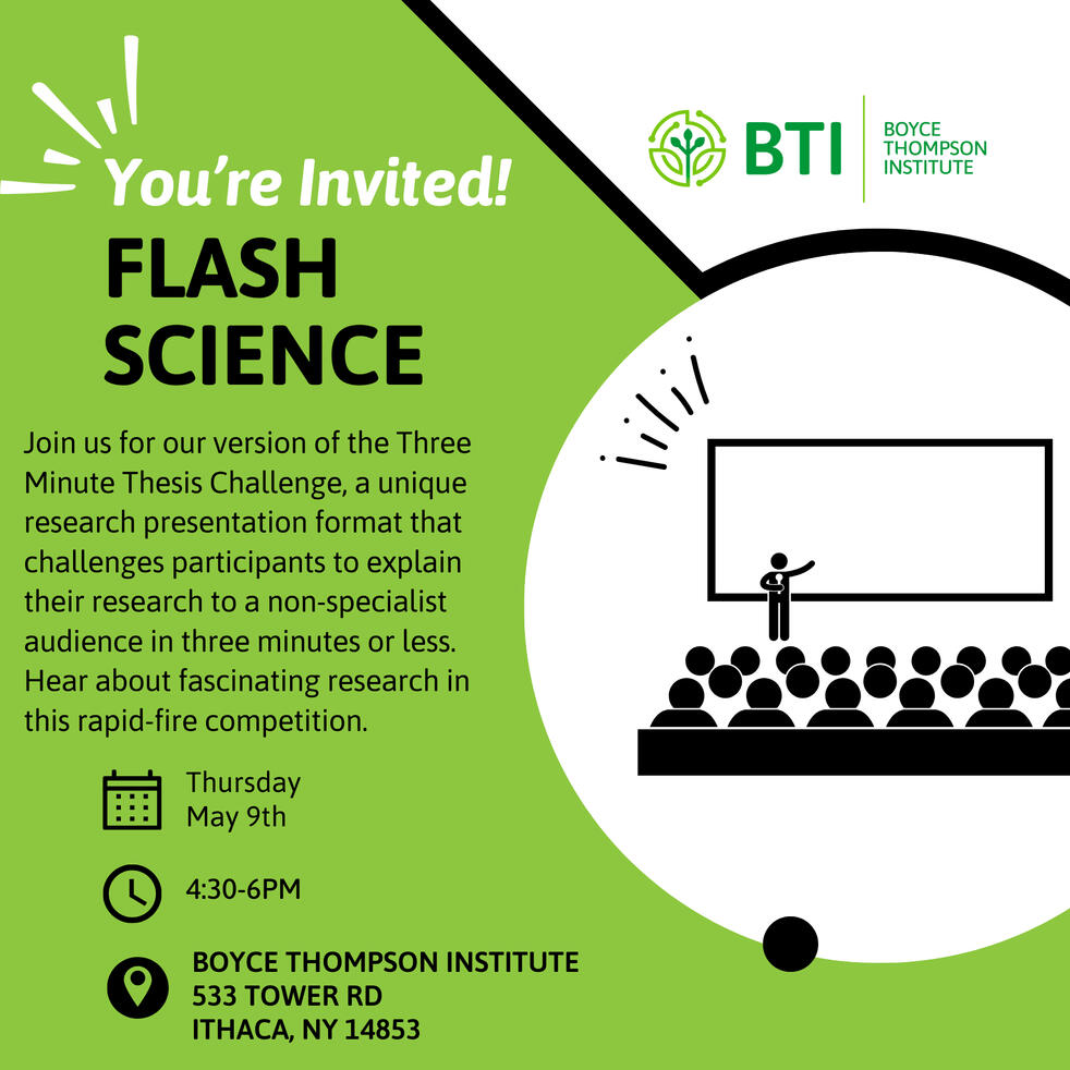Join us for our version of the Three Minute Thesis Challenge, a unique research presentation format that challenges participants to explain their research to a non-specialist audience in three minutes or less. Hear about fascinating research in this rapid-fire competition.Immerse yourselves in this highly accessible, fast-paced, and pitch-like communication format - think Shark Tank, but for science!This event is a testament to BTI's commitment to educating and inspiring the next generation of scientists.