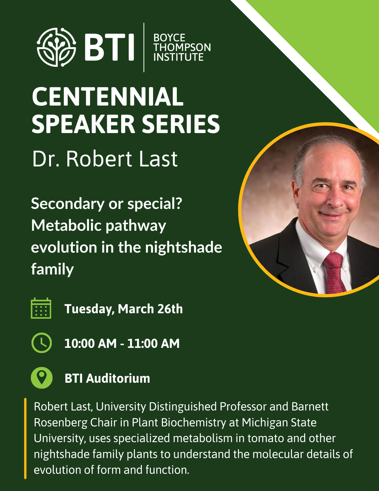 Please join us on Tuesday, March 26th, 2024 from 10-11:00am in the BTI Auditorium for the next speaker in our special Centennial Series, Dr. Rob Last.