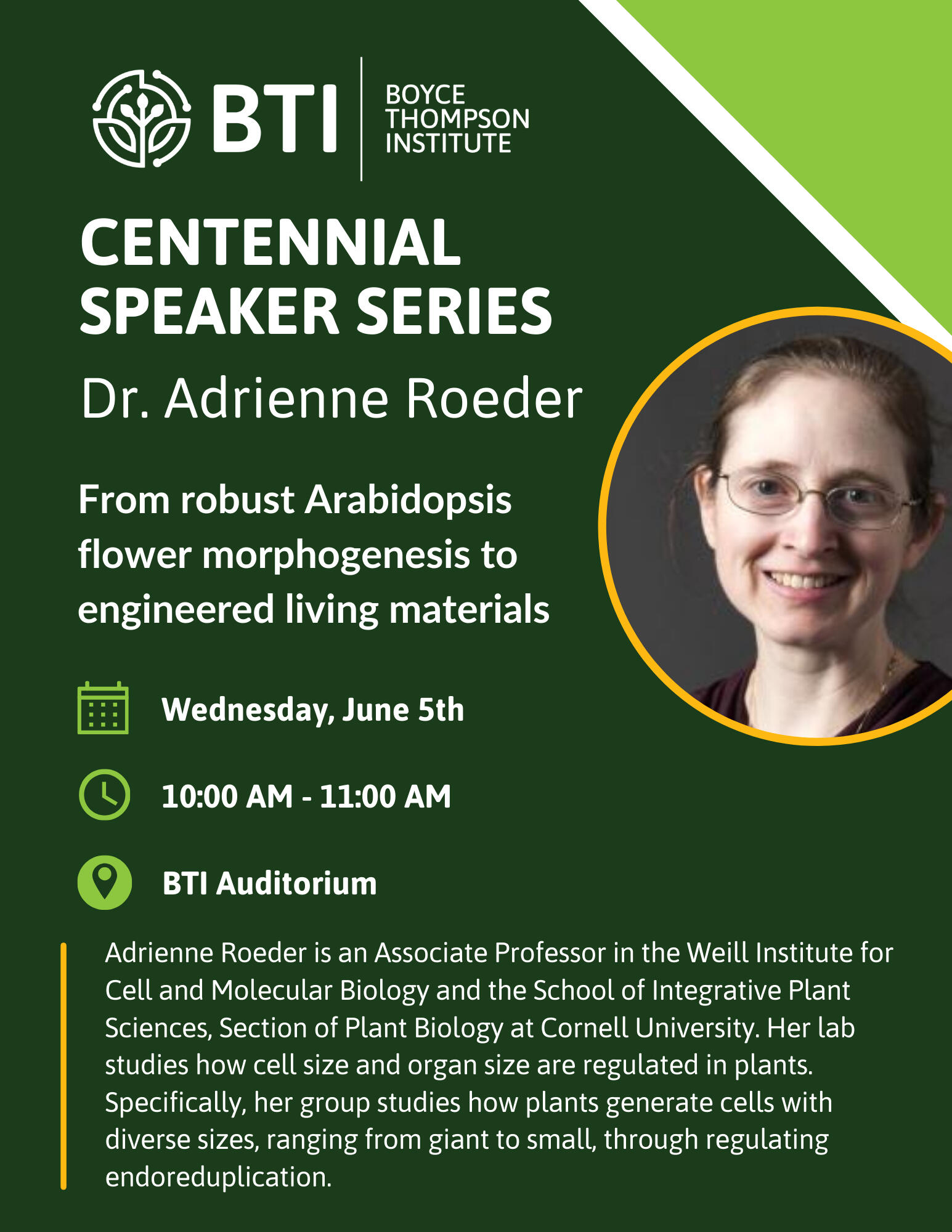 Please join us on Wednesday, June 5, 2024, from 10-11pm in the BTI Auditorium for the next speaker in our special Centennial Series, Dr. Adrienne Roeder.