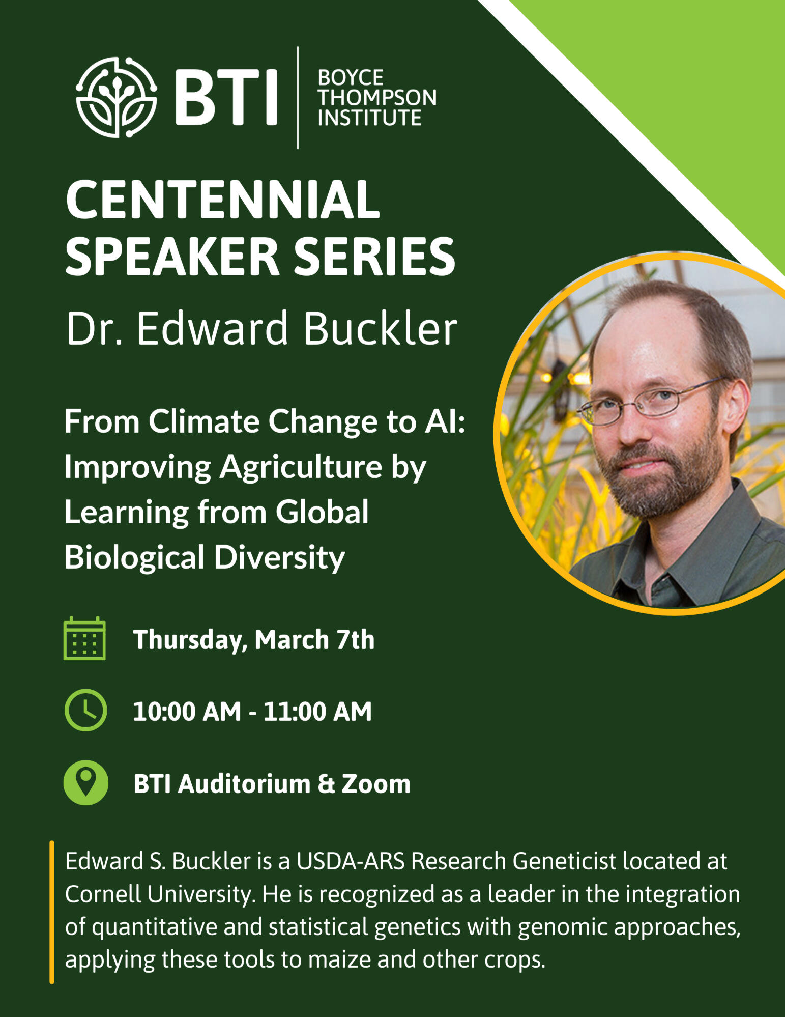 Please join us on Thursday, March 7, 2024, from 10-11:00am in the BTI Auditorium for the first speaker in our special Centennial Series, Dr. Ed Buckler.