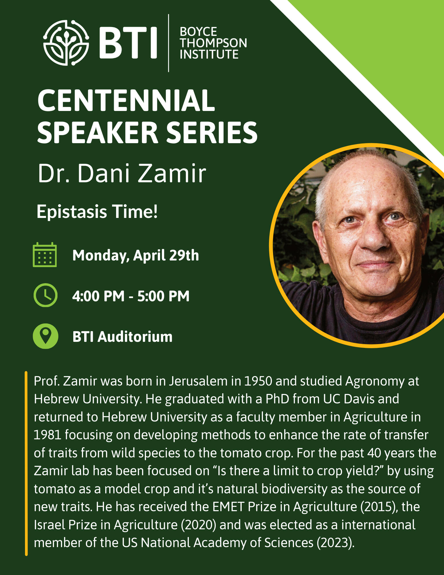 Please join us on Monday, April 29, 2024, from 4-5pm in the BTI Auditorium for the next speaker in our special Centennial Series, Dr. Dani Zamir.