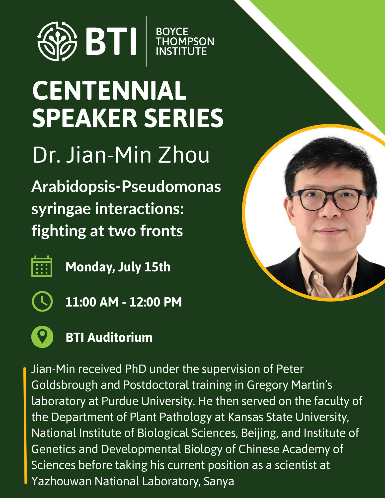 Please join us on Monday, July 15, 2024, from 11am-12:00pm in the BTI Auditorium for the next speaker in our special Centennial Series, Dr. Jian-Min Zhou.