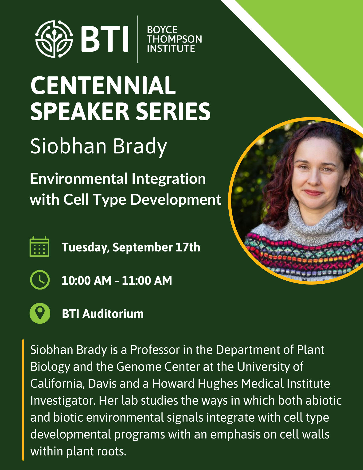 Please join us on Tuesday, September 17th, 2024, from 10-11am in the BTI Auditorium for the next speaker in our special Centennial Series, Siobhan Brady.