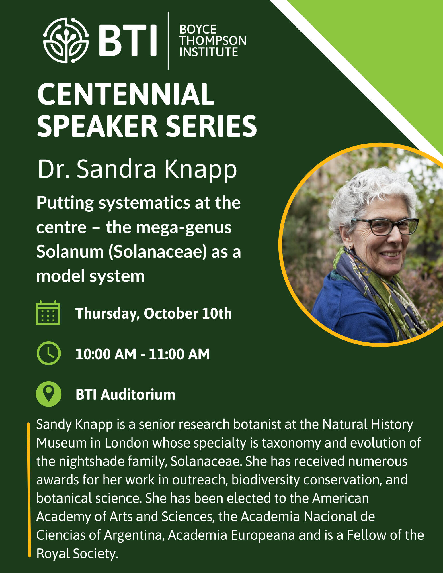 Please join us on Thursday, October 10th, 2024, from 10-11am in the BTI Auditorium for the next speaker in our special Centennial Series, Sandra Knapp.