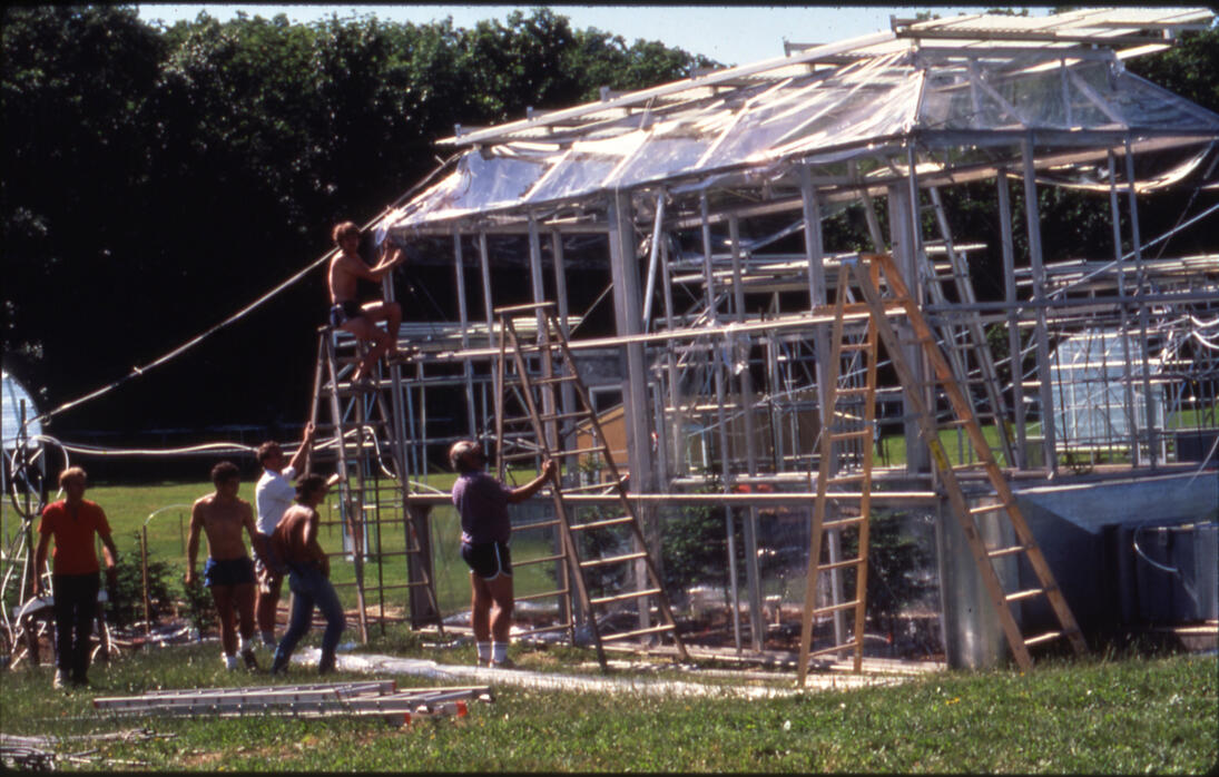 The Response of Plants to Interacting Stress (ROPIS) project was the single largest and most expensive research effort in the Environmental Biology Program. The picture of the field crew putting the plastic on the chambers gives you an idea of their size; this was al “All Hands” evolution.Due to the complexity of the construction process, the chambers were assembled at the BTI field research site but away from the specific locations at which they were to be used. They were so large and heavy that a helicopter was used to move them onto the field sites where the ozone and acid rain exposures would take place.The project was named ROPIS (Response of Plants to Interacting Stress) and ran from 1986 through 1991. It was funded by The Electric Power Research Institute, The Empire State Electric Energy Research Corporation, and the US Forest Service with an overall budget of about $4 million.The problem that drove the project was that red spruce trees in the Adirondacks in NY and the Red and White Mountains in NH and VT were declining from some unknown stresses. This was in the 1980s and ambient levels of ozone were high, and acid rain was also a concern.The study was designed to assess the individual and interactive effects of these two pollutants on the growth, physiology and nutrition of red spruce sapling trees. It also assessed the effects of acid rain on the chemistry of the soil in which the trees were growing.Red spruce saplings about 1 meter tall were obtained from near Millenocket, Maine, an area in which there were no reports of the trees being in decline. Trees were dug with a root ball of native soil that was kept as intact as possible. Trees and their root balls and native soil were placed into pots approximately 30” in diameter and 24” deep. The trees were placed into 18-wheeler trucks, driven overnight to the BTI field research site in Ithaca and unloaded by other Environmental Biology staff.The experiment used 12 chambers that were each 24 ft long (3 8-ft sections), 12 ft tall and 8 ft wide. Each chamber received one of four ozone treatment levels; 0.5X ambient, ambient, 1.5X ambient or 2.0X ambient Inside each chamber there were three sections, each section holding two red spruce trees in their pots. Each chamber had a top cover that could be drawn closed to exclude ambient rain.Each of the three 8 ft X 8 ft sections in a chamber received a different acid rain treatment at pH of 3.1, 4.1 or 5.1, and contained two trees in pots that were sunken to ground level in excavated holes. One pot rested on load cells so the tree, soil and soil water could be constantly weighed. This allowed us to know how much rain was applied, how the pot drained and how the tree used water by transpiration.That pot also had tension lysimeters buried at three depths in the soil profile so that water percolating through the soil profile could be collected for chemical analysis. Two cups were placed on top of the soil to collect water that had passed through the canopy of the trees.Thus, we were able to assess changes in chemistry from that of the rain we applied, to throughfall that had passed through the tree canopy, to how it changed as it moved through three depths of soil in the pot. Small samples of tree needles were also periodically obtained. Collectively, these samples allowed the complete cycle of precipitation biogeochemistry (rain applied, tree foliage, throughfall onto the soil, and soil water at three depths) to be assessed. This part of the study was conducted in collaboration with Natural Resources at Cornell.Rates of photosynthesis and respiration were regularly assessed for the trees. All trees were harvested (some at 3 years and all at 4 years) and biomass and nutrient composition assessed.Basically, the research showed that neither the ozone nor the acid rain produced a significant impact on the trees’ growth or physiology. Red spruce did not show the symptoms of decline that were observed in the field.